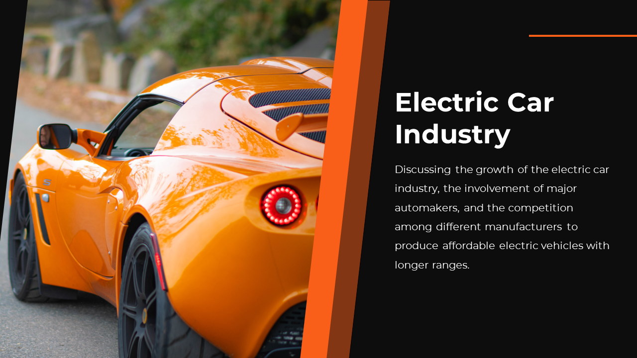 Electric cars, also known as electric vehicles (EVs), are revolutionizing the automotive industry. They offer a sustainable and environmentally friendly alternative to traditional internal combustion engine vehicles. Electric cars run on electricity stored in batteries, producing zero tailpipe emissions, reducing air pollution, and mitigating climate change. This template provides a comprehensive platform to educate and inform audiences about the benefits, technology, and future of electric cars. It offers visually engaging slides and informative content to showcase the advancements, challenges, and potential of electric vehicles, empowering individuals and organizations to embrace the transition to sustainable mobility.