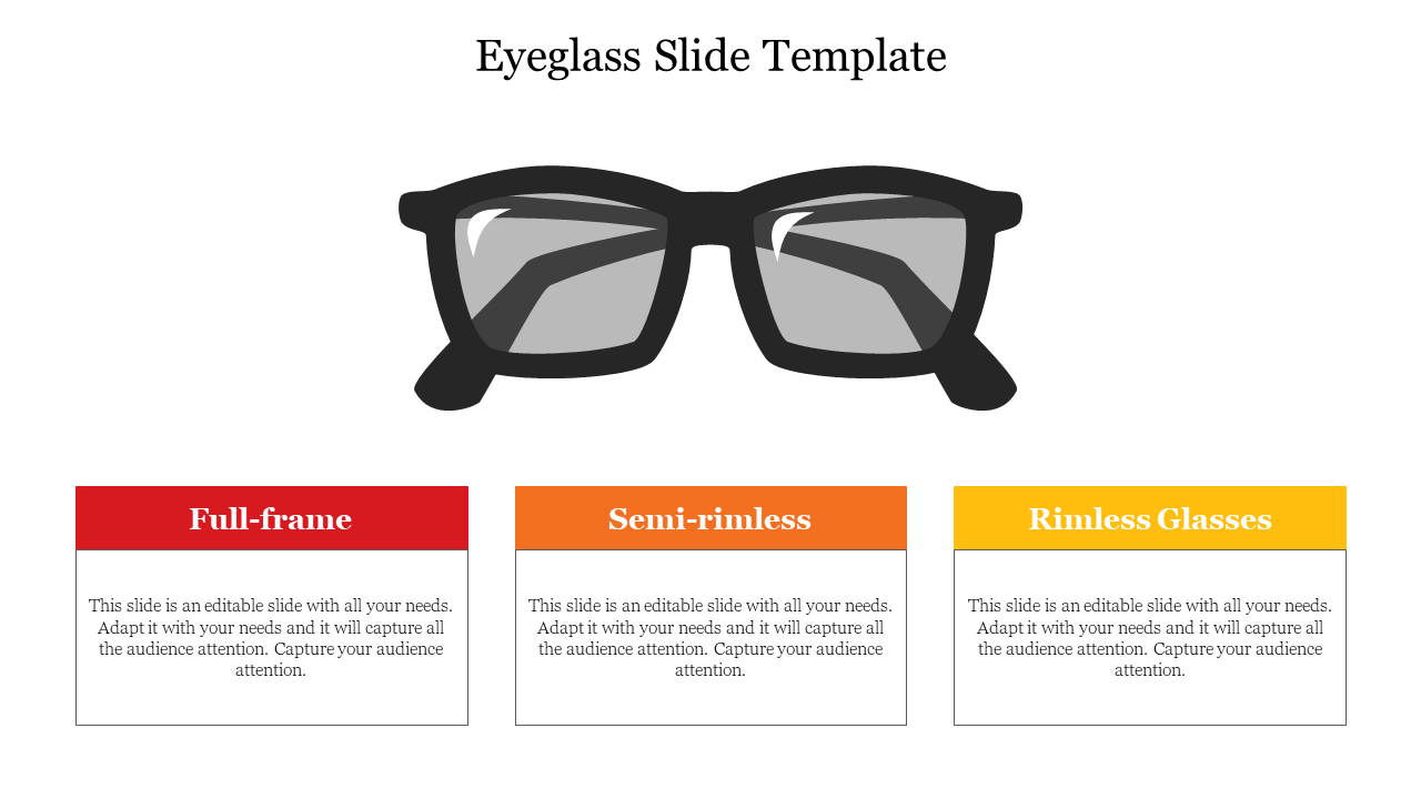Use this three noded eyeglass slide template on your various presentation slides related to the theme. In this template, you can find that the nodes explain full-frame, semi-rimless, and rimless glasses in a very crystal clear manner. The nodes given for you are spacious once through the caption and convey your points flawlessly.