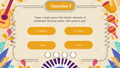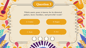 The Family Feud game is an interactive quiz format designed to challenge participants' knowledge about various categories of music. This engaging Family Feud PPT Template presents questions related to different music genres, prompting participants to provide accurate and comprehensive answers. This engaging quiz format combines entertainment with education, allowing participants to explore different musical categories while promoting friendly competition and deepening their musical understanding. It caters to music educators, enthusiasts, and anyone seeking to create an engaging musical environment, making it suitable for classrooms, music workshops, team-building events, and casual gatherings of music lovers. The template provides a convenient platform for hosting an interactive quiz on music genres, streamlining the process and ensuring a well-organized and enjoyable learning experience for participants. Featuring fully editable slides, it adapts to specific preferences and can be tailored to different musical settings. This user-friendly design makes it accessible even for those with minimal PowerPoint experience, allowing for easy customization to meet unique requirements. As the presenter, you'll find this template simplifies the process of conducting an engaging quiz, offering a visually appealing, well-structured platform that enhances the overall learning experience. Invite your audience to explore a fun and educational quiz about music genres—an interactive way to deepen their musical knowledge while enjoying a competitive and engaging activity.
