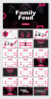 Family Feud template with a bright, game show theme featuring question rounds, team setup, and winning and game over slides.