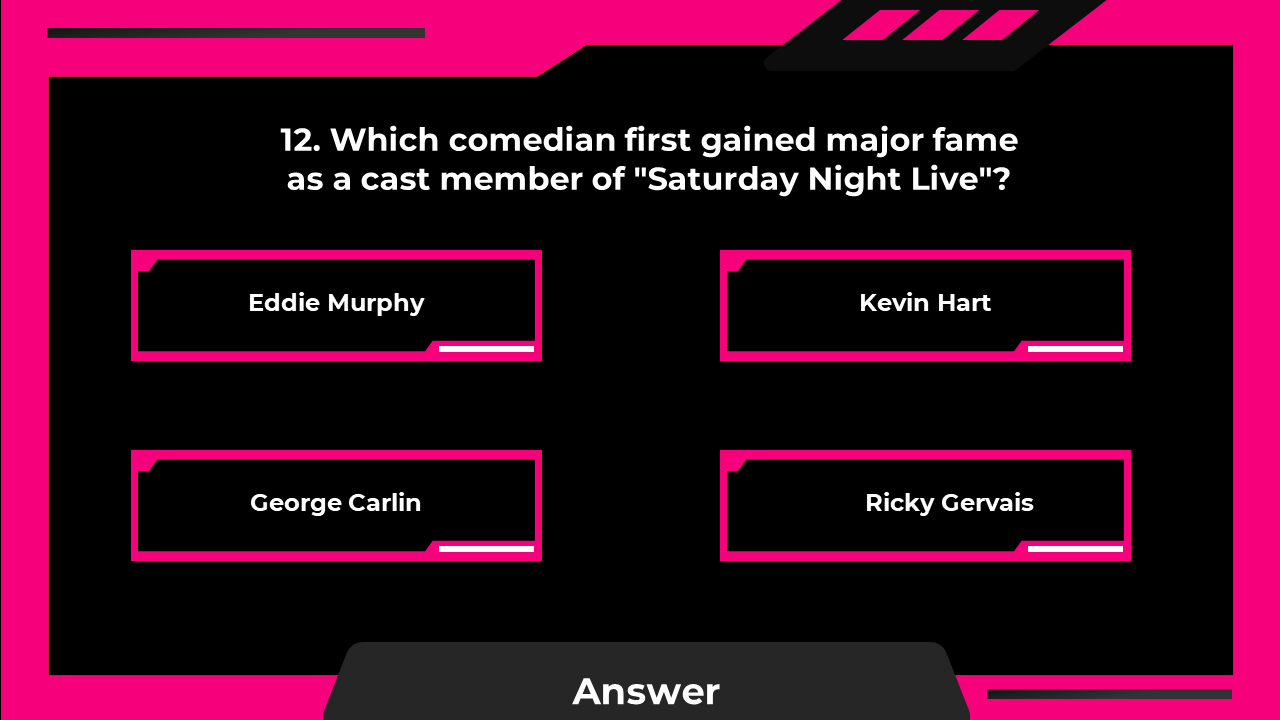 In the world of entertainment, the Family Feud PowerPoint game format has always been a hit, but picture this - merging the beloved game show concept with the world of famous comedians. The outcome is an uproarious quiz that revolves around legendary comedians, testing participants on their knowledge of stand-up comedians, iconic jokes, famous routines, and the laughter-inducing world of humor. This isn't just a test of comedy knowledge; it's a deep dive into the hilarious universe of stand-up legends, offering a quiz experience that's as funny as it is informative. Laughter is guaranteed in this one-of-a-kind game that will keep everyone in splits. This specialized template is a gem for event organizers, comedy club owners, and educators seeking to host engaging comedian-themed quizzes. The fully editable slides make it easy to present questions, comedian profiles, and hilarious anecdotes. By using this resource, presenters can create a fun, interactive, and laughter-filled quiz that appeals to comedy enthusiasts and fans of humor. The template's versatile design ensures a seamless and entertaining presentation, leaving both the presenter and participants in stitches. The use of this template ensures an event that combines the joy of comedy with the excitement of a classic game show, and we wholeheartedly encourage all comedy lovers to give it a try. Get ready for a hilarious experience like no other!
