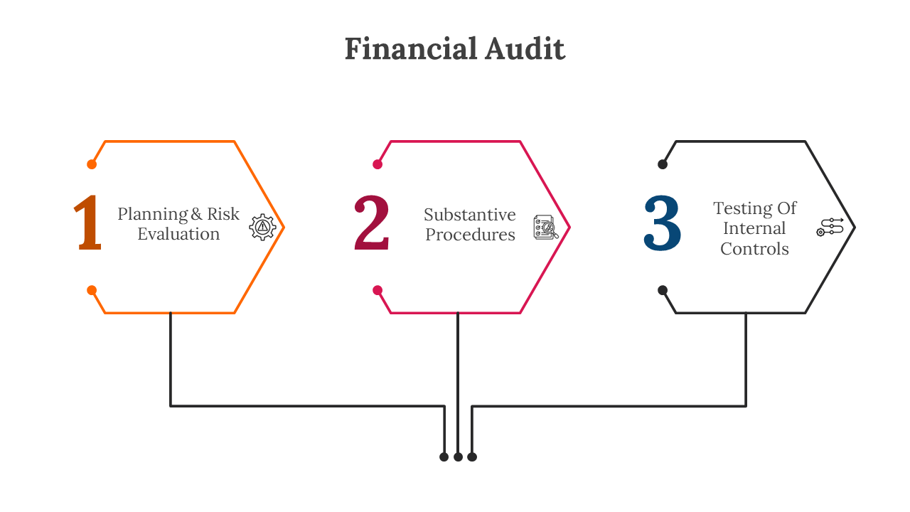 Financial audits are a critical process that ensures the accuracy and integrity of an organization's financial records. They involve a comprehensive examination of financial statements, accounting records, and supporting documentation to evaluate if they reflect a true and fair view of the company's financial position. Auditors conduct these assessments to provide stakeholders, including shareholders, regulators, and management, with assurance about the organization's financial health. A well-executed financial audit enhances transparency, compliance with financials reporting standards, and can uncover any irregularities or discrepancies that may require corrective action. This Financial Audit PowerPoint template is a valuable resource for professionals engaged in financial auditing and related presentations. It offers a comprehensive set of fully editable slides tailored to financial audit topics, simplifying the process of creating engaging and informative presentations. The template can be used by auditors, finance professionals, financial audit authorities, and educators to explain complex audit concepts, present audit findings, or provide training on audit procedures in the financial services sector. With its flexibility, users can easily customize each slide to suit their specific needs, whether it's reporting to stakeholders, training new auditors, or showcasing best practices in financial audit, thereby saving time, maintaining a professional image, and effectively conveying key audit-related information to their audience.