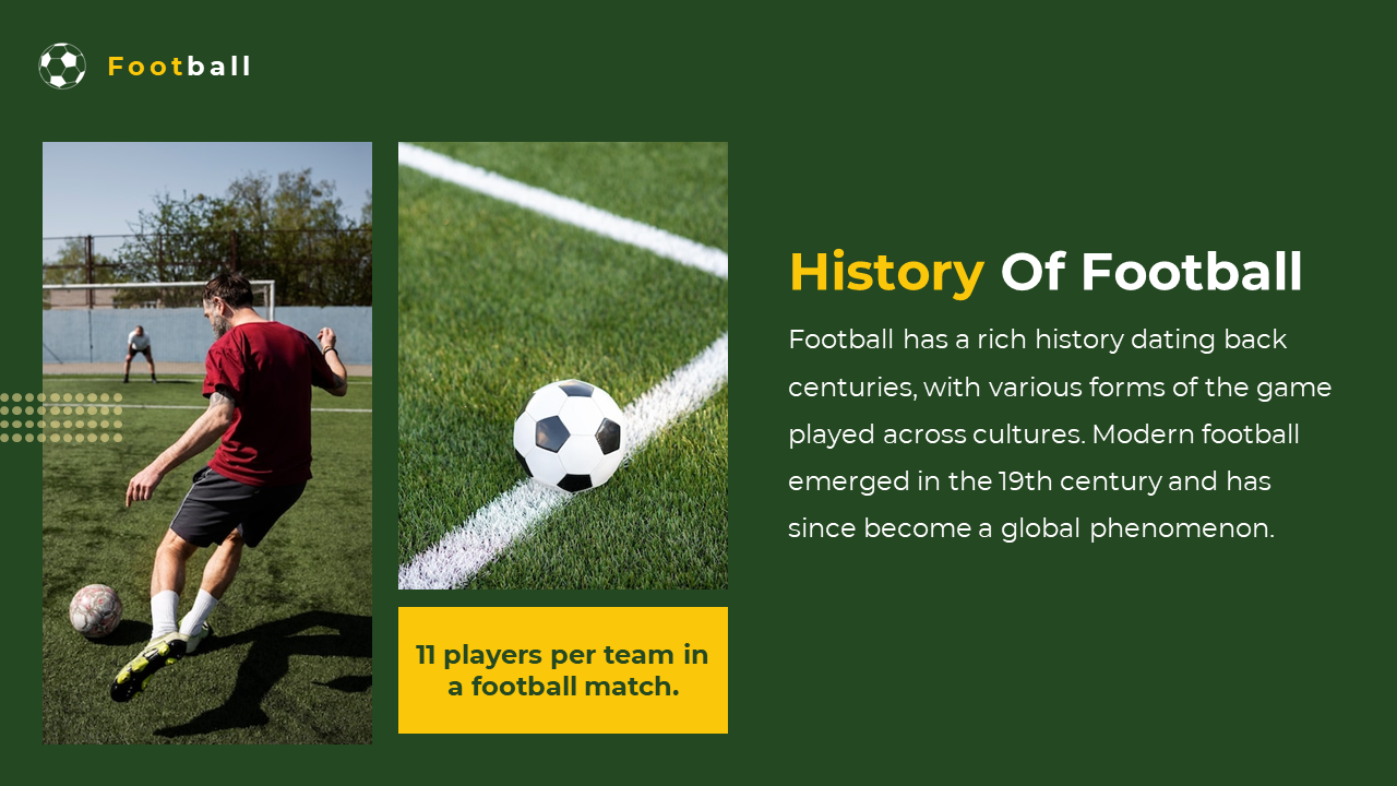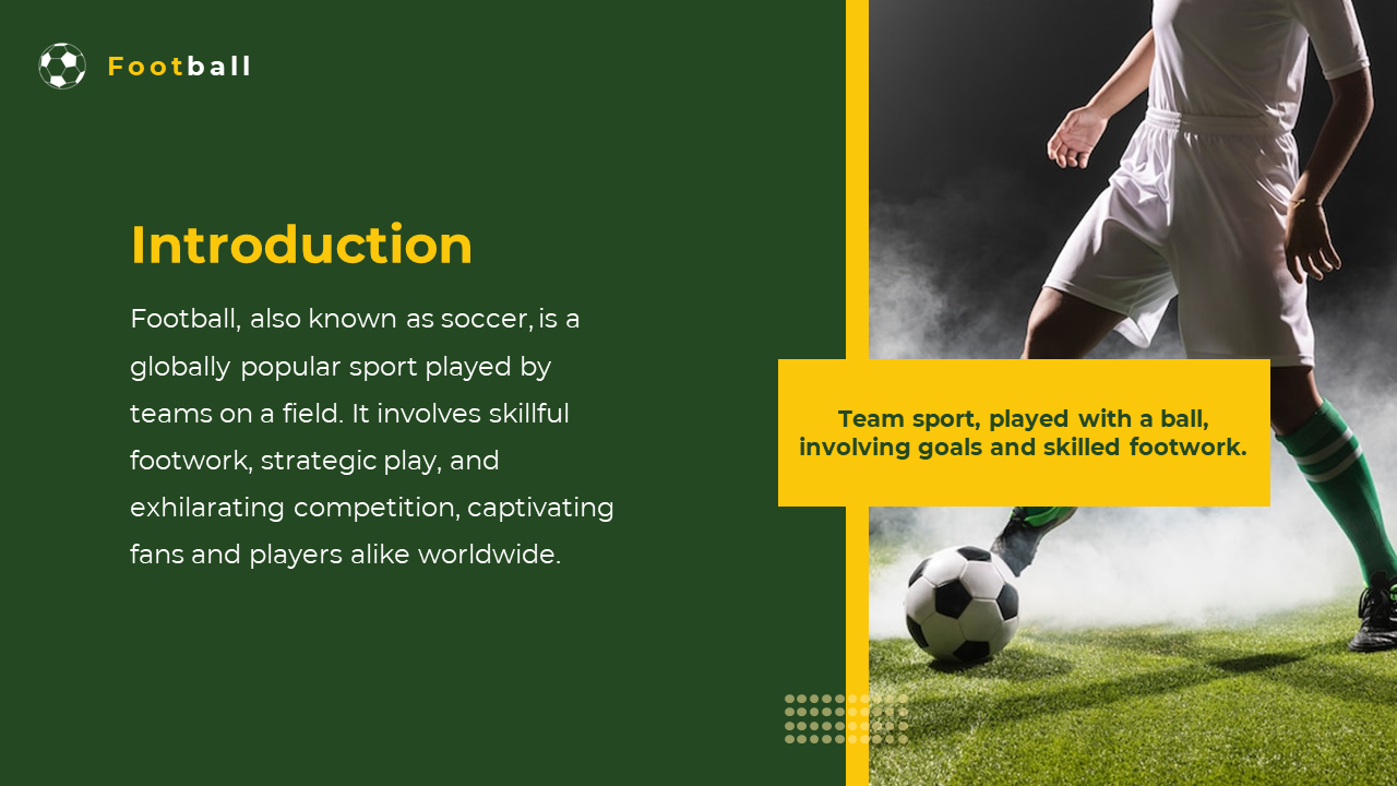 This "Football Presentation Slides" is perfect for creating presentations related to the game of football. Football is a popular sport played by millions of people around the world. Two teams try to score goals by kicking the ball into the opponent's net. Football promotes teamwork, physical fitness, and strategic thinking.