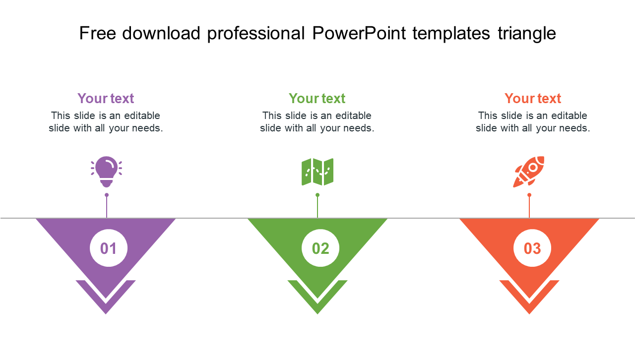 Want to display your idea or plan in a multi-layer triangle at a formal meeting.? Get our Free Professional Triangle PowerPoint Templates for a better presentation. This PowerPoint provides you with all the PowerPoint essential elements and three icons. Users can use this triangle slide to present their business strategies or opinions in a business meeting. This PowerPoint contains three inverted pyramid concepts with editable captions to add your information. The PPT focuses on essential things like writing down your goal, project idea, etc. Users can add or modify a logo and text color if possible. Users can select any Triangle PowerPoint slides for their needs.