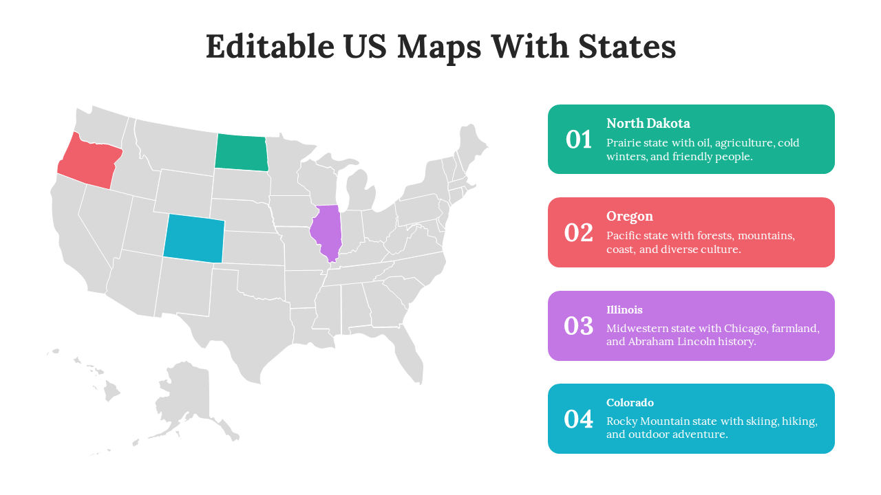 Like a patchwork quilt stitched together from diverse fabrics, the US map is a vibrant tapestry of states and regions, each with its own unique character and story. From the sunny beaches of Florida to the towering peaks of Colorado, each state has something special to offer. But more than just a beautiful work of art, a US map with states is a powerful tool for conveying information and data. Our US map with states slide is an invaluable resource for visualizing geographic data and making compelling presentations about US states.