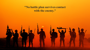 Download our stunning Free Military PowerPoint Background Templates to design an engaging army presentation. This editable Military template's stylish look and a group of army man standing background design will keep your audience's eyes on your presentation. This Army template is 100% editable. It comes with a dark theme to improve the user's information. It will also be possible to add text at the bottom to improve its look. You can also use these Free Military PowerPoint Background Templates as your wallpapers or screensavers because of their beautiful look and feel. We also have a collection of templates for the Military background PPT slide. You can also print, share or save this template for future reference.