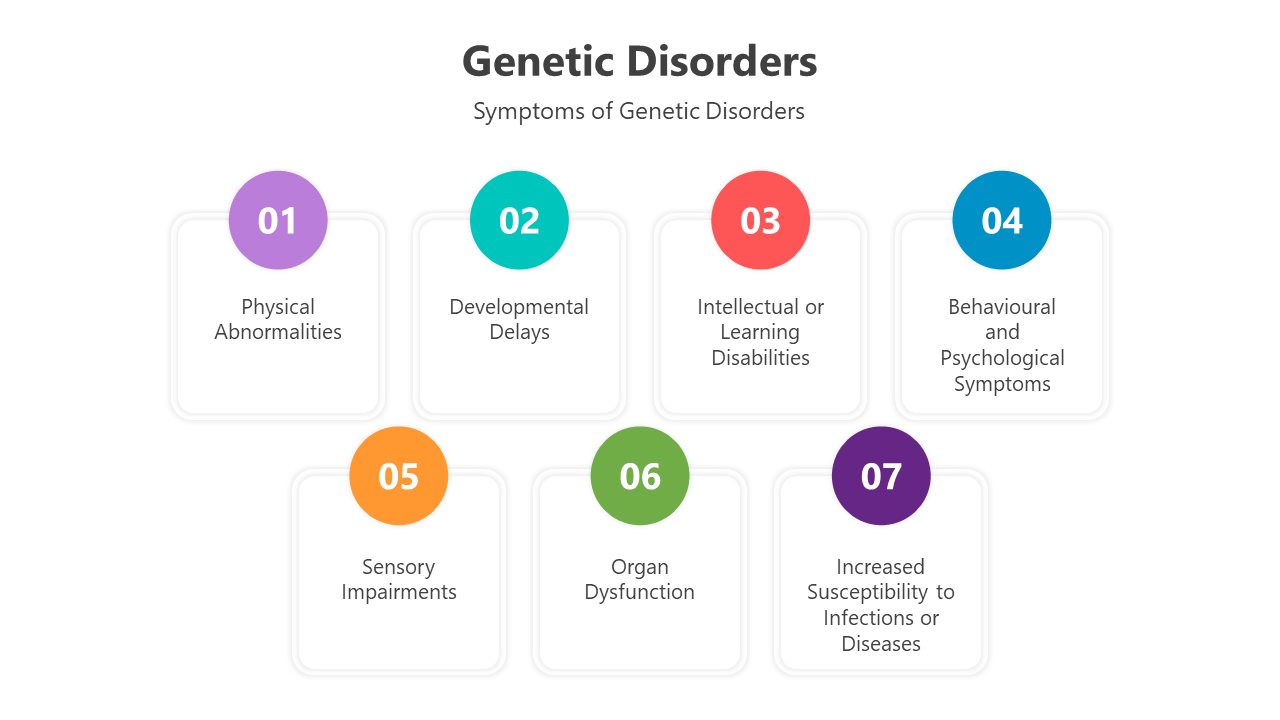Genetic disorders arise from anomalies in an individual's DNA, impacting how cells function and develop. These disorders can be inherited from parents or result from mutations in genes during a person’s lifetime. Common examples include cystic fibrosis, sickle cell disease, and Down syndrome. Each disorder affects patients differently, leading to various health challenges that require specialized care and management.
