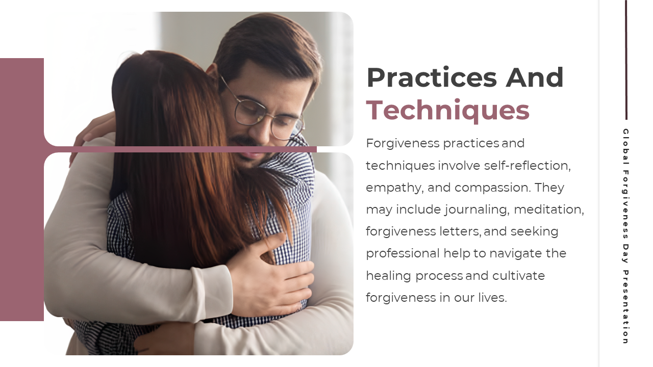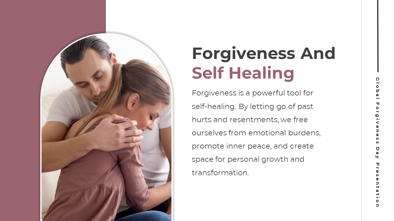 Global Forgiveness Day is a day dedicated to promoting forgiveness and its transformative power. It encourages individuals to let go of grudges, resentments, and negative emotions, fostering healing and personal growth. This day reminds us of the importance of forgiveness in maintaining healthy relationships, enhancing mental and emotional well-being, and creating a more peaceful world. It serves as a reminder that forgiveness is a choice we can make to free ourselves from the burdens of the past and embrace a future filled with compassion, understanding, and harmony. With our presentation, you can create a high-quality presentation that will leave a lasting impression on your audience about Global Forgiveness Day. You can impress your audience with this sleek template, delivering an informative presentation.