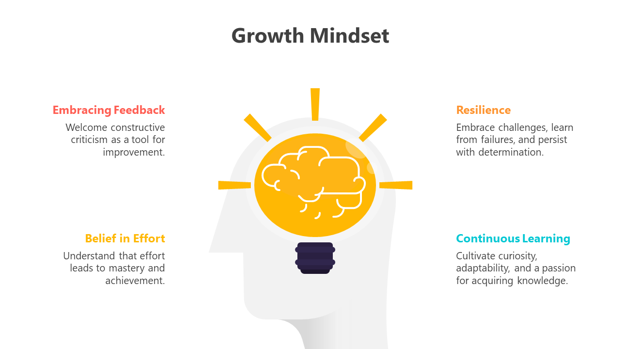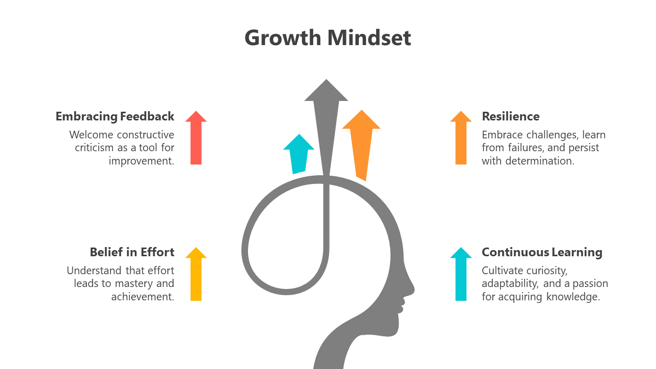The Growth Mindset, a transformative approach to personal and professional development, instills the belief in one's capacity to learn, adapt, and progress through dedication and effort. It encourages individuals to perceive challenges as opportunities for growth and fosters resilience in the face of setbacks. Shifting from a fixed mindset to this growth-oriented outlook empowers people to pursue continuous improvement, unlocking untapped potential. The Growth Mindset PowerPoint template, with fully editable slides, is a valuable resource for educators, corporate trainers, coaches, and personal development enthusiasts. Ideal for workshops and seminars, it simplifies the presentation of growth mindset principles, saving time and enhancing clarity. Presenters benefit from increased audience engagement and a deeper understanding of the concept, fostering proactive attitudes toward self-improvement. Encourage your audience to harness this template's power, inspiring themselves and others to embrace the transformative potential of a growth mindset for greater success in all aspects of life.