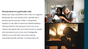 Parents shouldn't anticipate the moon and the stars from us. They need some attention and valuable time from us! On Parent's Day, let them know how essential they are in a few short phrases. On National Parent's Day, take your parents to a special meal and engage in meaningful conversation. We unfurl the lovely assortment of Happy Parents’ Day slides to help you deliver your greetings, wishes, and heartwarming photos and quotations to your most beloved parents. Impress your parents with these adorable layouts from Parents Day PowerPoint Templates. The templates have different nodes and backgrounds that are all different colors. This template's structure can be modified to meet the presentation's theme. Send your well-wishes and create a beautiful smile on your parents' faces to cherish it forever!