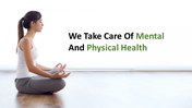 Clinic PowerPoint slides presenting mental and physical health services, featuring a yoga session and health program details.