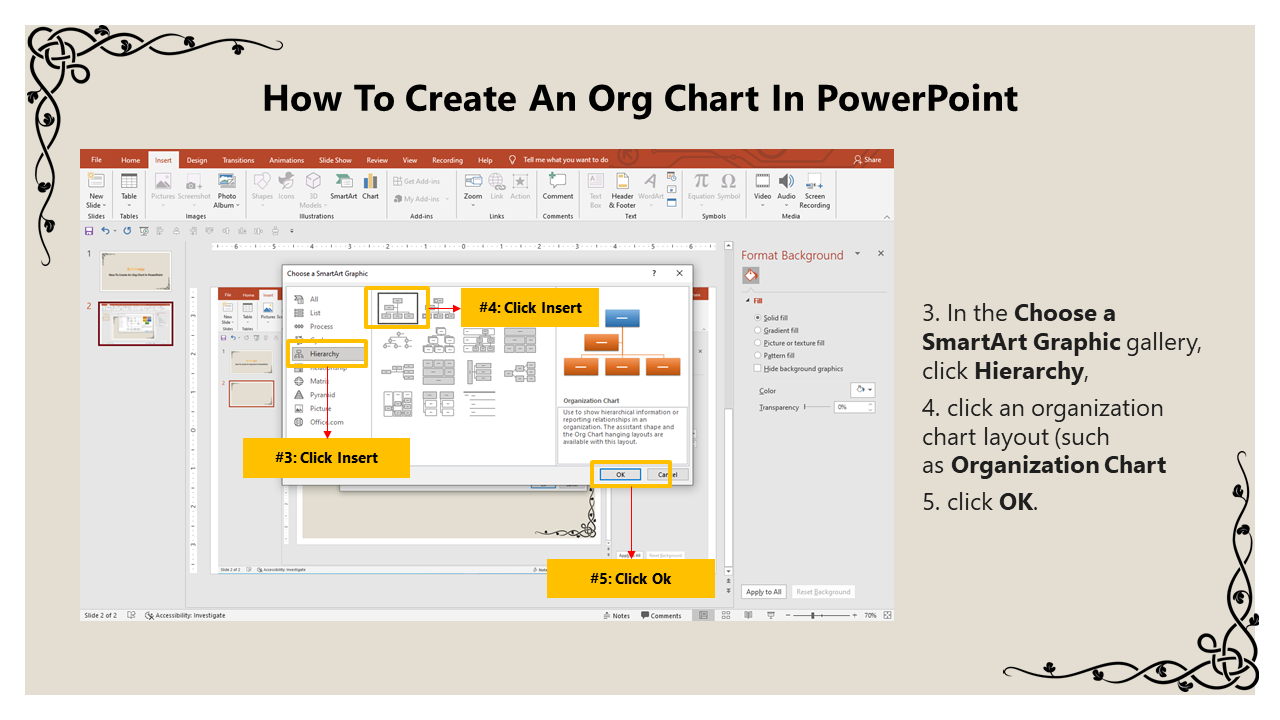Step 5: Click on the OK button. Now, you can see the selected organization chart layout in your slide.