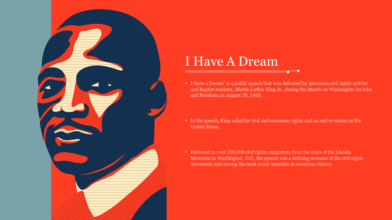 "I Have a Dream" is the title of a speech delivered by civil rights leader Martin Luther King Jr. on August 28, 1963, during the March on Washington for Jobs and Freedom. The speech is widely regarded as one of the most important in American history and played a key role in the passage of the Civil Rights Act of 1964. King spoke about his dream of racial equality and a world free of discrimination, inspiring millions to join the fight for civil rights. By using our template, you can convey your message in a clear and concise manner.