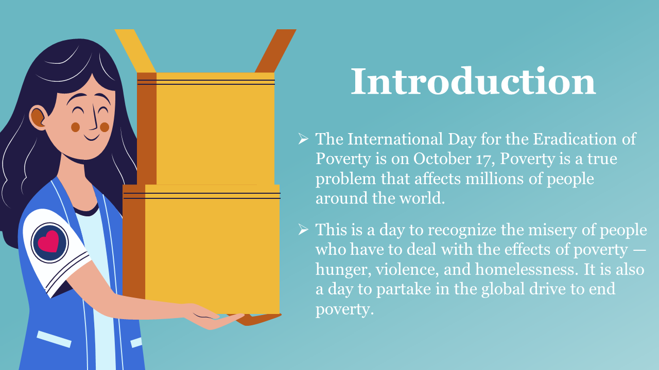The International Day for the Eradication of Poverty is observed every year on October 17th to raise awareness about the need to eradicate poverty in all countries. The day aims to promote dialogue and understanding of poverty-related issues and highlight efforts to end poverty worldwide. This observance was first officially recognized by the United Nations in 1992. Despite global efforts, over 700 million people still live in extreme poverty, making this day an important reminder of the need for sustained action to end poverty. By using a template related to this topic, one can create presentations, infographics, and other visual aids to spread awareness and educate others about the importance of poverty eradication.