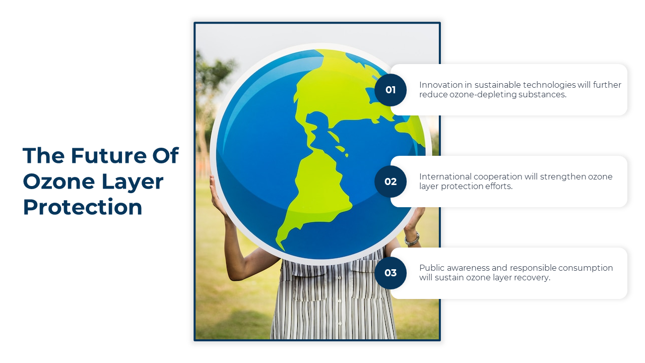 World Ozone Day, also known as the International Day for the Preservation of the Ozone Layer, observed every September 16th, is a global initiative emphasizing the protection of Earth's vital ozone layer. This protective shield in the stratosphere shields life from harmful ultraviolet (UV) radiation. It serves as a reminder of our responsibility to combat ozone layer depletion and honors the Montreal Protocol, a treaty striving to phase out ozone-depleting substances. Our World Ozone Day PowerPoint is an indispensable resource for educators, environmentalists, and advocates. It simplifies the creation of engaging presentations on ozone layer conservation, and its fully editable slides enable customization. Utilize this template to effectively convey the importance of ozone preservation, engage your audience, and inspire action for a healthier planet. Join us in safeguarding the ozone layer for a sustainable future.
