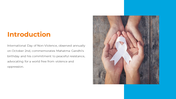 The International Day of Non-Violence, observed on Mahatma Gandhi's birthday, underscores the enduring relevance of his philosophy of non-violence as a means to achieve social and political change. It serves as a global reminder of the power of peaceful resistance and dialogue in resolving conflicts and advancing human rights. This day celebrates the principles of compassion, tolerance, and understanding, emphasizing that non-violence is not merely the absence of physical aggression but a proactive commitment to justice, equality, and social harmony. Our template provides a versatile tool for educators, activists, and advocates to create impactful presentations about this important day. With its fully editable slides and professional design, it simplifies the process of crafting compelling content. Users can customize the template to resonate with their audience, making it an effective means to communicate the significance of the International Day of Non-Violence, inspire action, and encourage individuals and communities to embrace non-violence as a guiding principle for a more peaceful world.