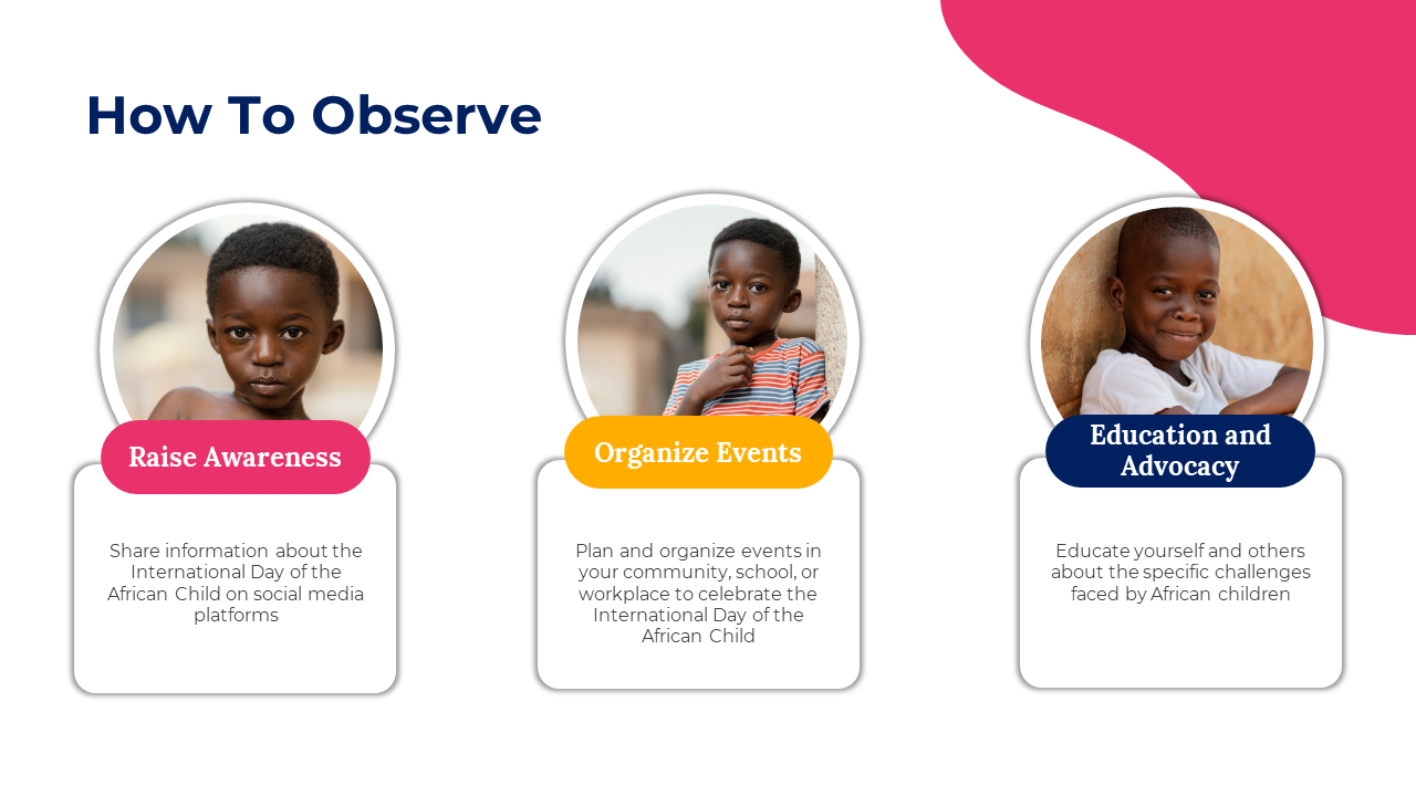 International Day of the African Child, celebrated on June 16th, aims to raise awareness about the unique challenges faced by African children and promote their rights to education, healthcare, and protection. This template provides a comprehensive and visually appealing platform to showcase the significance of this important day and can be customized for various presentations, enabling others to effectively spread awareness and advocate for the well-being of African children.