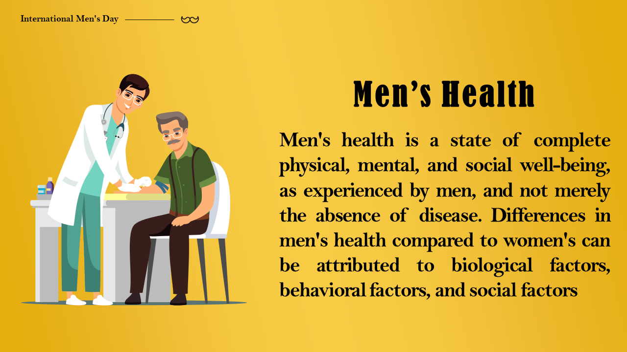 Professor Thomas Oaster established International Men's Day in 1991, while calls for it date back to the 1960s. International Men's Day aims to raise awareness of the problems that men and boys encounter throughout their lives. This day strives to praise the accomplishments of men worldwide and commemorate their contributions to society at large. You can learn how to honor men while working toward gender equality through this Men's Day PPt. Use this editable presentation to improve your presentation and work toward a goal.
