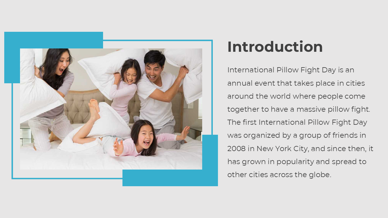 Do you know where the joy comes from? It comes from doing things that bring us joy. Pillow fight day is celebrated in April month on the first Saturday. The focus to celebrate this day is intended to be a cheerful celebration of spring that inspires individuals to interact with others in their neighbourhood. In 2008, the first international Pillow took place, and the event has taken place in cities such as New York, London, Berlin, Tokyo, and Sydney. This is a one-of-a-kind and enjoyable way to connect with others while also celebrating the arrival of spring. So, to help you have fun, Slide Egg has created a pre-made slide deck. It consists of 36 slides, each of which contains unique information about this day. Explore it! It is open to change.