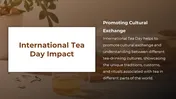 Delve into a world of diverse flavors and cultural traditions on International Tea Day, celebrated every December 15th. This global observance honors the time-honored art of tea preparation and its rich cultural significance. From the bustling streets of Asia to the serene tea rooms of Europe, it bridges continents and nurtures connections through the simple act of sharing a cup of tea. Enrich your International Tea Day presentations with our customized PowerPoint template. Tailored for tea enthusiasts, educators, and cultural advocates, this template offers a range of fully customizable slides. From showcasing tea varieties to sharing brewing techniques, it simplifies content creation. Enhance your presentation with vibrant visuals, informative content, and interactive elements that resonate. Our template empowers you to authentically convey the essence of tea culture. By utilizing this template, you engage your audience and bring the global celebration to life. Seize the opportunity to unite others in commemorating International Tea Day, inspiring them to utilize this template for sharing their own tea experiences. Craft a presentation that's both enlightening and enjoyable, fostering a deeper appreciation for the world of tea.