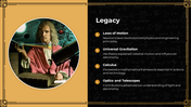 Sir Isaac Newton, a towering figure in the annals of science, left an indelible mark on human understanding with his groundbreaking work. Best known for his monumental work "Philosophiae" Naturalis Principia Mathematica, or the Principia, Newton's contributions spanned physics, mathematics, and astronomy. His biography tells the story of an insatiably curious mind whose relentless pursuit of knowledge reshaped these fields. Our Sir Isaac Newton PowerPoint provides a dynamic platform for presenting Newton's life, work, and enduring impact. Ideal for educators, researchers, students, and history enthusiasts, it simplifies complex scientific concepts through engaging visuals and design. Customizable slides ensure seamless integration into presentations, saving time and effort. Embrace this template to inspire a deeper appreciation for Scientist Sir Isaac Newton's legacy and the wonders of science.