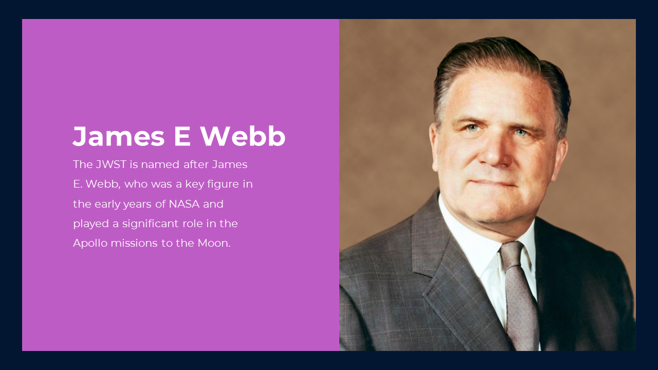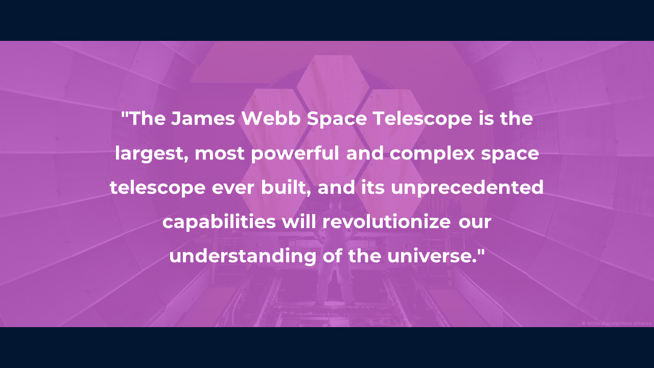 The James Webb Space Telescope is a large, infrared-optimized telescope set to launch in 2021. It will be the largest and most powerful space telescope ever built, with a primary mirror that is 6.5 meters in diameter. The telescope is a collaboration between NASA, the European Space Agency, and the Canadian Space Agency. Its mission is to explore the universe, from our own solar system to the most distant galaxies. It is named after James E. Webb, who served as the second administrator of NASA from 1961 to 1968. With our James Webb Space Telescope presentation template, you can easily showcase the incredible capabilities of this groundbreaking mission and explore the wonders of the universe.