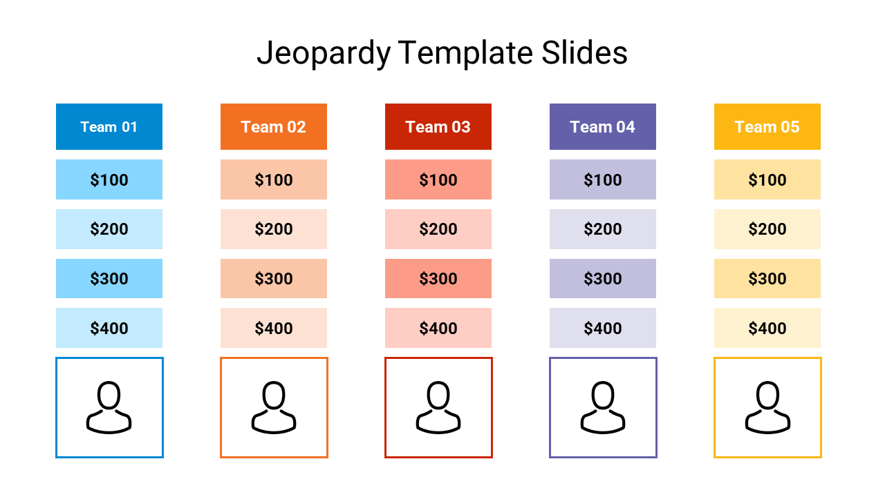 Jeopardy game slide with five teams labeled 01 to 05, each with four dollar amounts ranging from $100 to $400.