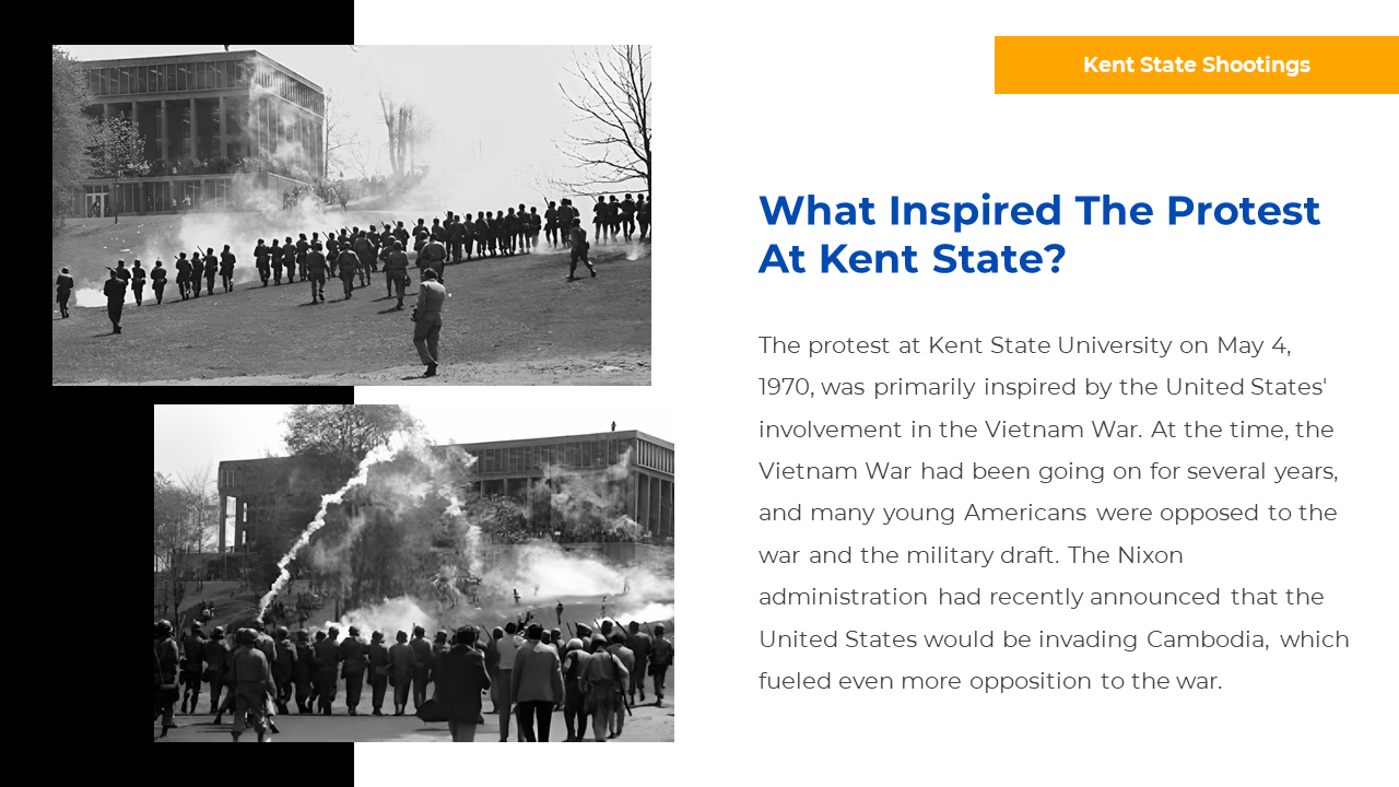 Step into a pivotal moment in American history with the Kent State Shootings. This tragic event occurred on May 4, 1970, when National Guardsmen opened fire on unarmed students protesting the Vietnam War at Kent State University. The shootings resulted in the loss of four lives and left an indelible mark on the nation's consciousness. The Kent State Shootings stand as a powerful reminder of the tensions and dissent during a tumultuous era. As we reflect on this event, we honor the lives lost and consider its lasting impact on the discourse around civil rights, free speech, and the role of government in times of crisis. Designed for educators, historians, and individuals exploring the Kent State Shootings, this templates is a versatile tool for creating informative presentations. It's ideal for discussing the historical context, examining the causes and consequences, and fostering a deeper understanding of this pivotal event. With user-friendly slides, it simplifies the process of creating presentations that educate, inspire dialogue, and commemorate the lives lost. This templates comprises a variety of slides, each tailored to highlight different aspects of the Kent State Shootings, from the events leading up to the tragedy to its aftermath and its place in American history. With customizable layouts, presenters can seamlessly navigate through different facets of the Kent State Shootings and effectively convey the historical context and significance. Whether you're analyzing the events, discussing the impact on civil liberties, or fostering a deeper understanding of the era, this template equips you to create a presentation that educates, inspires dialogue, and pays tribute to the lives affected by this pivotal event.