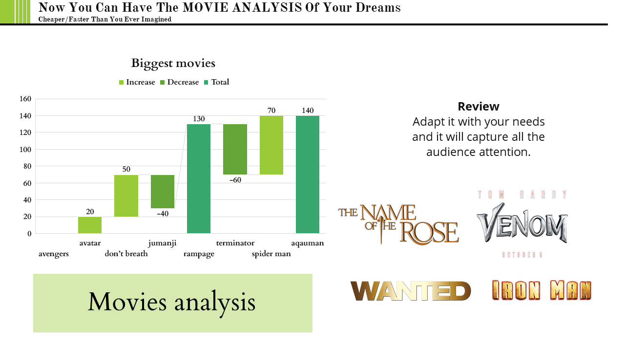 Embark on a cinematic journey of insights with our KPI dashboard PowerPoint template tailored for movies. Imagine a green-themed canvas adorned with a dynamic bar graph, showcasing movie names and logos. This isn't just a slide; it's your ticket to presenting movie KPI reports with flair. Each element, meticulously designed, transforms data into a visual spectacle.