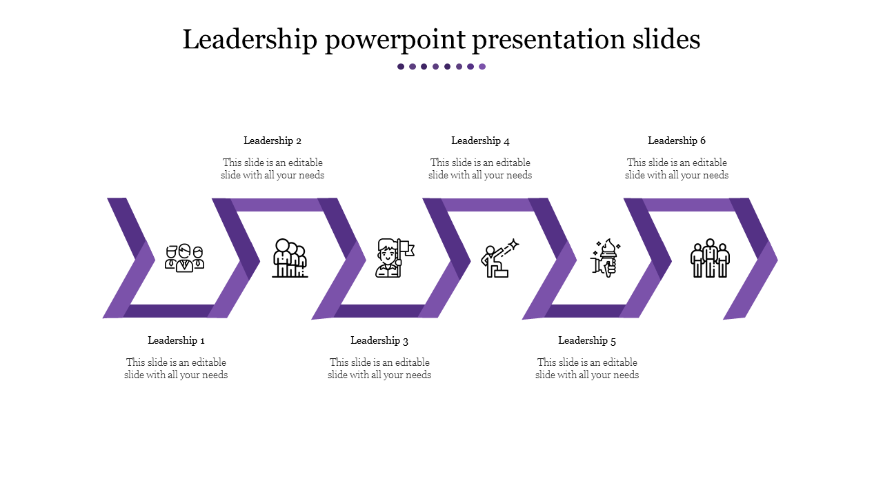 Imagine creating a presentation that commands attention and leaves a lasting impression. This template makes it a breeze! It features a bold purple arrow with six icons, each ready for your leadership insights. Captions, titles, and text areas keep your message clear and organized.
