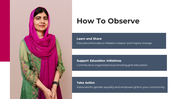 Unleash the power of education and bravery with Malala Day. On July 12th, we honor Malala Yousafzai, a global advocate for girls' education and the youngest Nobel Prize laureate. Discover her remarkable journey, her fight for equal access to education, and the impact she has made worldwide. Our presentation offers a comprehensive exploration of Malala's story, providing inspiring quotes, key milestones, and ways to support her mission. Empower your audience with knowledge and inspire them to take action for education equality with our informative slides.