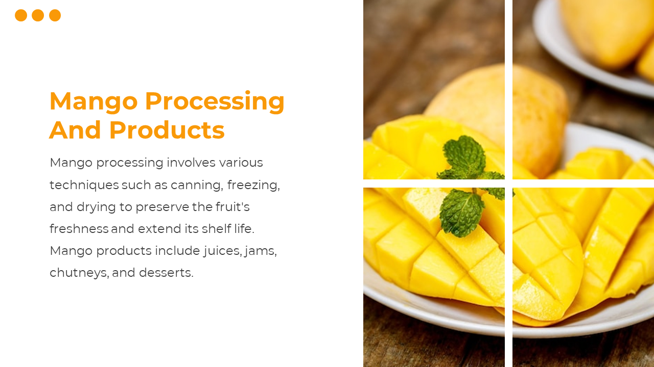 Mango is a tropical fruit known for its sweet, juicy, and aromatic flavor. With its vibrant color and refreshing taste, it is a favorite among fruit lovers worldwide. This template celebrates the delectable mango, offering a variety of mouthwatering recipes, nutritional information, and tips for selecting and preparing mangoes. From smoothies to salads, explore the versatility of this tropical delight and indulge in its tropical goodness with this enticing template. You can use this template if you want to explain this idea to your audience.