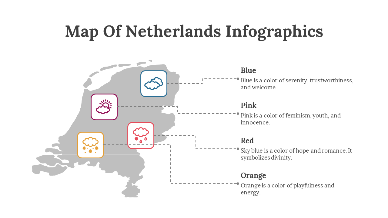 Get this editable Netherlands Map Infographics Template and Google Slides to make stunning presentations about the Netherlands. We offer this deck with 36 incredible slides to make your slide show astonishing. These slides are creatively made with a well-designed map of the Netherlands. You can use this deck to talk about this country, such as its capital, provinces, important locations, travel routes, regions, landmarks, currency, language, weather, population, tourism, etc. It has editable text boxes, graphs, and maps to enrich your presentation. So, why not try this deck?
