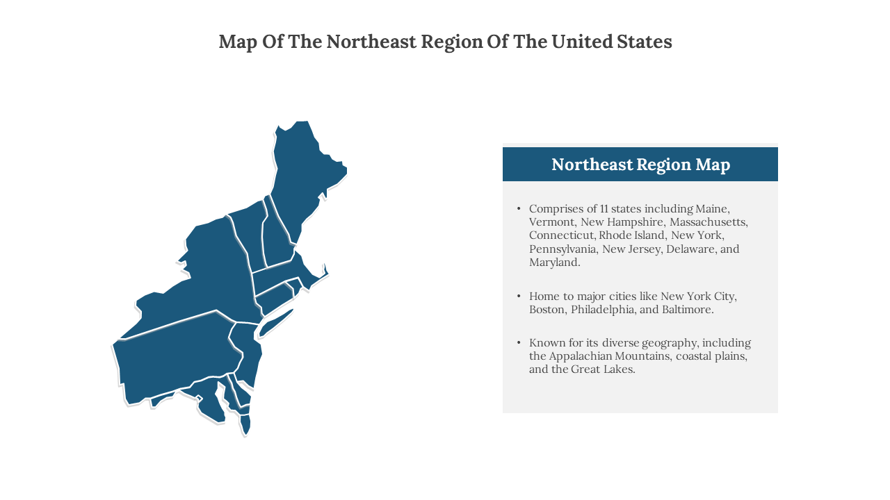 The Northeast Region of the United States is located in the northeastern part of the country and consists of 11 states: Maine, Vermont, New Hampshire, Massachusetts, Rhode Island, Connecticut, New York, New Jersey, Pennsylvania, Delaware, and Maryland. The region has a diverse landscape that includes mountains, forests, lakes, rivers, and coastal areas. Boston, New York, Philadelphia, and Baltimore are considered major cities in the Northeast Region of the US. Use our editable map of the Northeast Region of the US for your upcoming presentation. We have designed the slide with different hues and ample space for content. Our bundle highlights important cities and the unique features of each city with recently updated data. Engage your audience by showcasing our eye-catching map presentation.