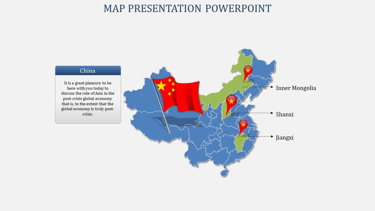 The "China Map PowerPoint Template and Google Slides" is a visual tool featuring a map of China with four markers indicating specific locations. The map includes the flag of China in the top left corner and markers positioned in Inner Mongolia, Shanxi, Jiangsu, and Jiangxi.