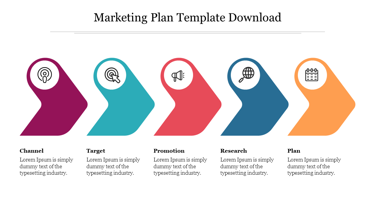 This is a five nodded template. Each node is denoted by unique shaped clipart included with an icon. The icon represents the channel, target, promotion, research, and place. Each node has a caption and description space. The nodes are horizontally arranged in neat order.