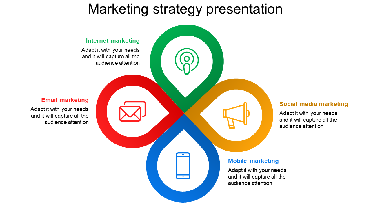 Marketing strategy presentation is employed to consolidate different plans of action and, therefore, the steps involved in implementing them. A marketing strategy presentation template is also helpful because it allows business owners to provide clear instructions, not research and implement details. In addition, the template is fully customized and is user-friendly.