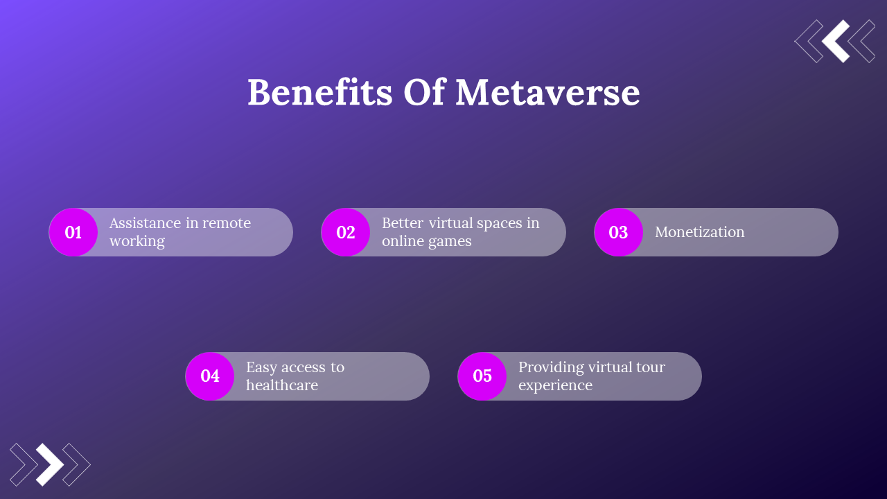 The Metaverse is a three-dimensional virtual universe, much like the internet. It is a virtual world where users can communicate via avatars, explore and build virtual things, and access services and information. This 36-slide package includes a pick of PPT slides that will assist you in creating a skilled display. The slides contain a range of backdrops, pictures, and layouts to make your exhibit stand out. The falls are customizable to fit your unique needs and are consistent with Google Slides and PPT. This bundle is ideal for building a dynamic and effective display that captivates your audience's attention.