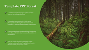 Scenic forest slide with a mountain view at sunset, a central quote banner, and four icons with captions at the bottom.