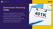 Unlock the power of retirement planning with the National 401k Day PowerPoint template! Celebrated annually, National 401k Day raises awareness about the importance of 401(k) retirement plans and promotes long-term financial planning. A 401(k) plan is a valuable tool offered by employers, allowing employees to save for retirement on a pre-tax basis. With fully editable slides, this template is ideal for HR professionals, financial advisors, and benefits educators to create engaging presentations. It provides a platform to explain the benefits of 401(k) plans, highlight contribution strategies, discuss investment options, and offer retirement savings tips. Customizable content, visually appealing layouts, and charts make it easy to simplify complex concepts and tailor the presentation to specific audience needs. Empower your audience to take control of their financial future with this versatile template, inspiring them to make informed decisions and maximize the advantages of their 401(k) plans on National 401k Day and beyond. If you want to celebrate this day or explain the information to others, you can use this template.