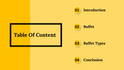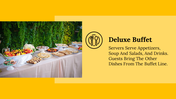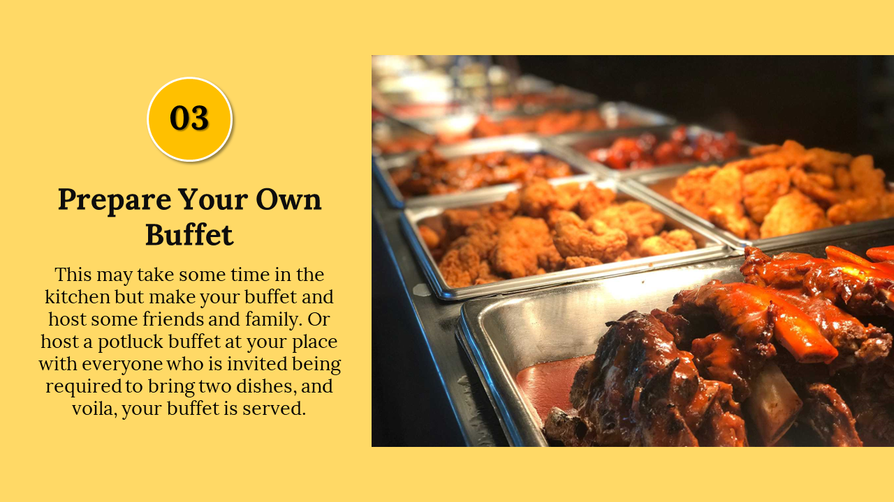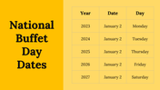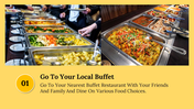 National Buffet Day is an annual event that takes place on January 2nd, where people can indulge in an array of food from various cultures and cuisines. This day offers a perfect opportunity to explore the world of food and appreciate its diversity. It's a great time to visit buffets and restaurants that offer an extensive selection of dishes. With our customizable and editable slides, you can showcase the history and evolution of buffets, the different types of buffets, and the most popular dishes that are typically served. You can impress your audience with this sleek template, delivering an informative presentation.