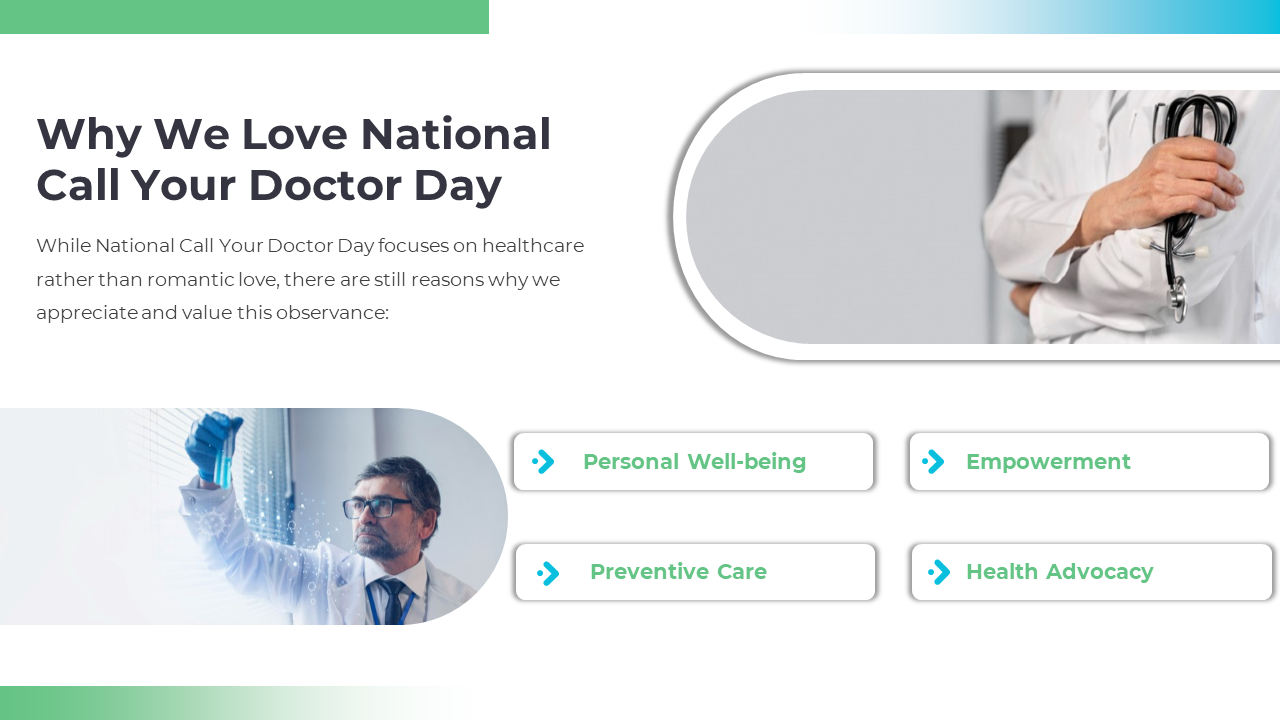National Call Your Doctor Day is a reminder to prioritize your health and proactively reach out to your healthcare provider. It emphasizes the importance of regular check-ups, preventive care, and open communication with your doctor. This template provides a comprehensive platform to deliver a persuasive presentation on the significance of this day, highlighting the benefits of timely medical consultations and empowering individuals to take control of their well-being. With its professional design and customizable features, this template is a valuable resource for creating impactful presentations across various healthcare topics and campaigns.