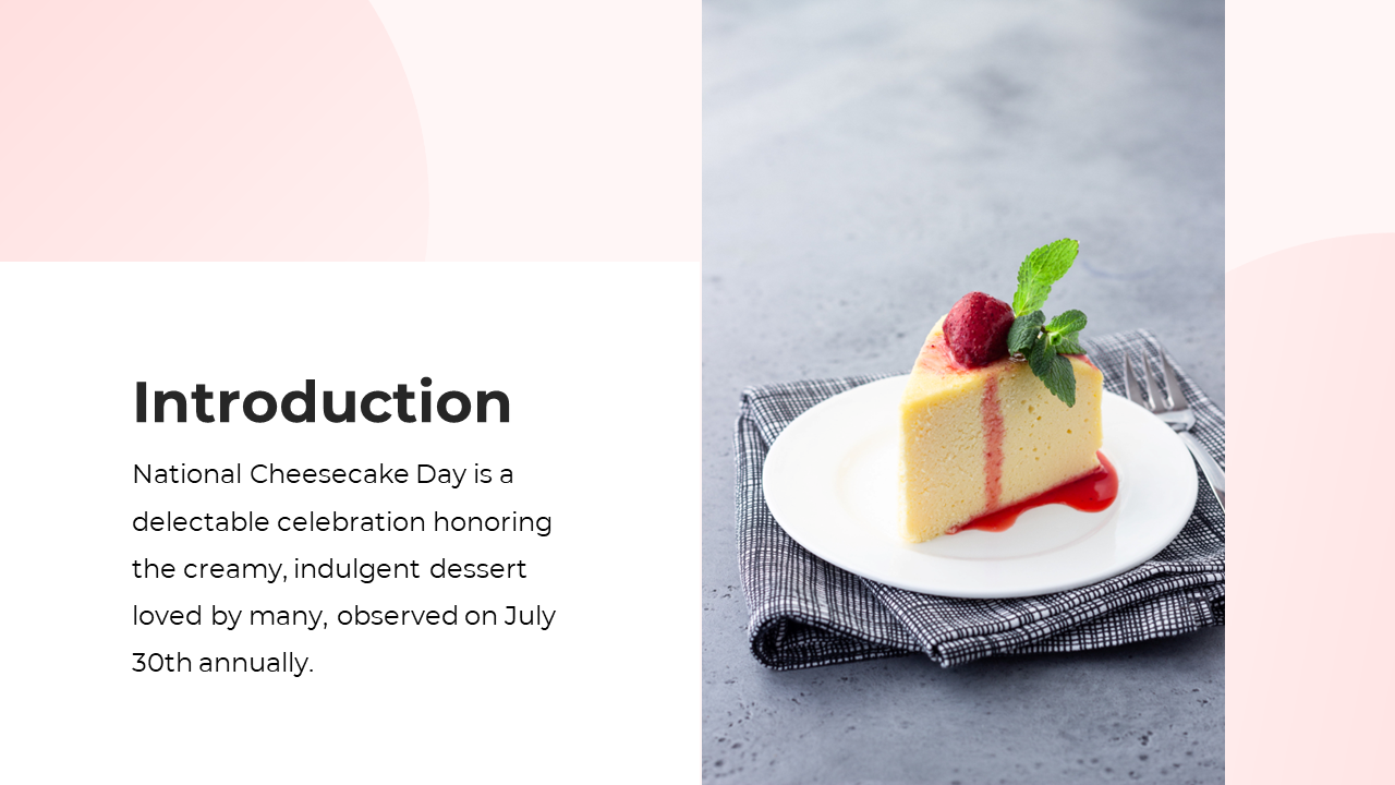 Indulge in a slice of creamy delight on national cheesecake day! Celebrated on July 30th, this delectable occasion honors the dessert loved by many. Delve into the history, flavors, and variations of cheesecake, from classic New York style to decadent fruity and chocolatey creations. Our presentation offers a tantalizing visual journey through the world of cheesecake, providing interesting facts, recipes, and tips to create a mouthwatering experience for your audience.