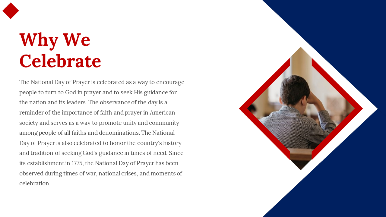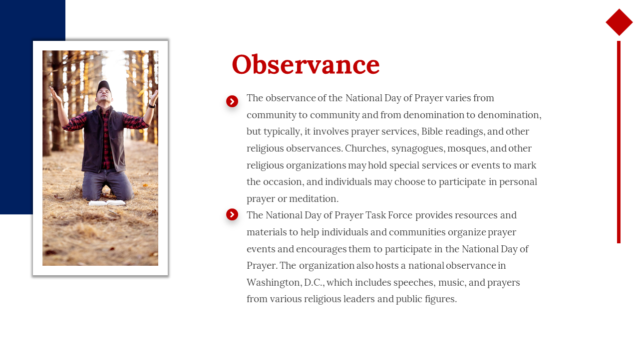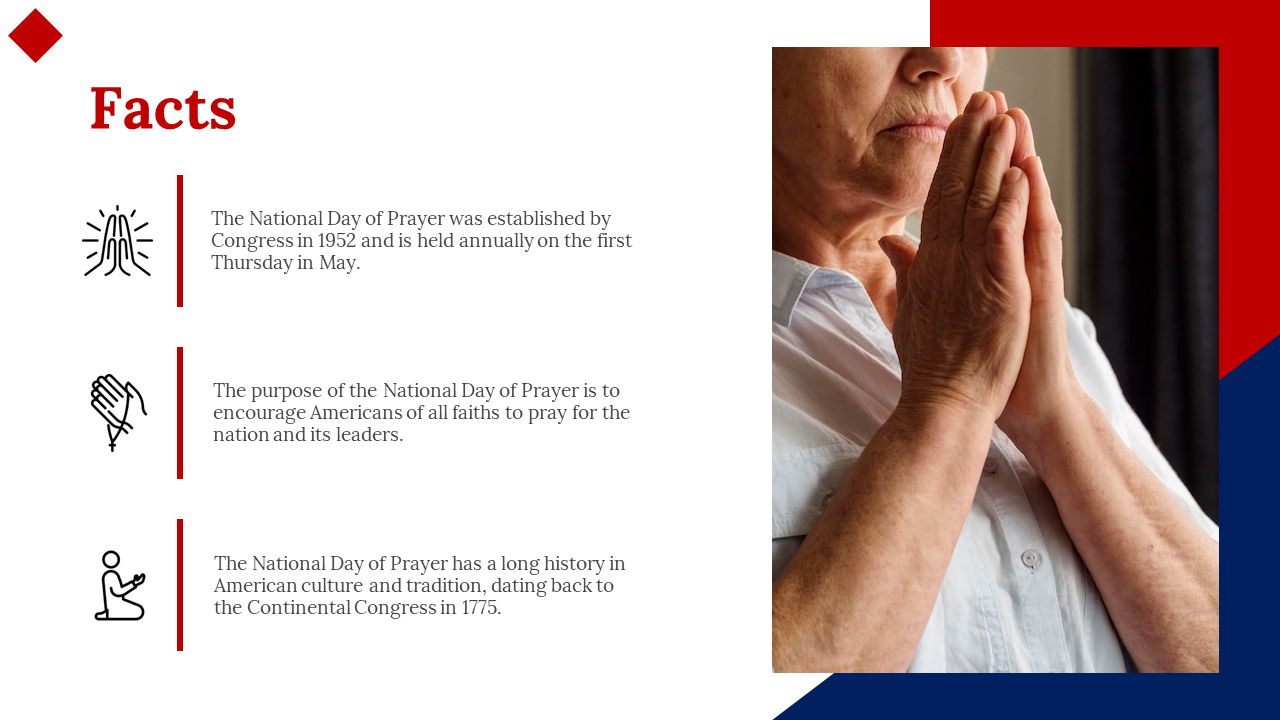 National Day of Prayer is an annual observance in the United States that encourages people to pray for the nation and its leaders. Observed on the first Thursday of May, the day brings together people of all faiths to unite in prayer for the well-being of the country. A National Day of Prayer template can be used to organize and plan prayer gatherings, such as interfaith services, vigils, and group prayers. With a template, it's easier to coordinate events and ensure that participants have a meaningful and spiritual experience. Let's come together and lift our voices in prayer for a brighter future.