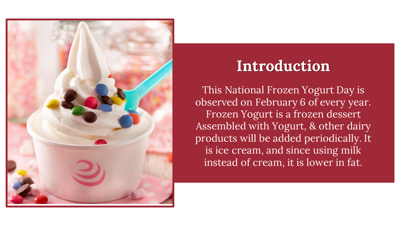 National Frozen Yogurt Day is a food holiday celebrated annually on February 6th in the United States. It is a day to enjoy and celebrate the delicious and healthy frozen dessert known as frozen yogurt. Many frozen yogurt shops and chains offer special deals and promotions on this day to attract customers and celebrate the holiday. This template offers a variety of customization options, including different color schemes and layout choices, so you can make your presentation unique and visually appealing. It is compatible with both PowerPoint and Google Slides.