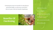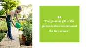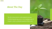 National Gardening Day is an annual celebration in the US that takes place on April 14th each year, dedicated to recognizing the positive impact of gardening. This special day encourages people to come together to recognize the impact and importance of gardening for our environment, health, and well-being. With our 36 slides, you can present information about the event, its history and benefits, activities, gardening tips, and more. This template is a great resource for anyone looking to teach more about National Gardening Day.