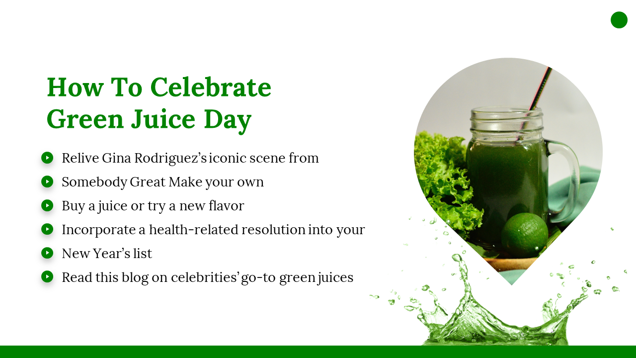 National Green Juice Day, celebrated on January 26th every year, is all about promoting the health benefits of drinking green juice. Green juices are packed with essential vitamins, minerals, and antioxidants that can boost your immune system, improve digestion, and even help with weight loss. Whether you're a green juice enthusiast or just starting out, National Green Juice Day is the perfect opportunity to try out new recipes, experiment with different ingredients, and learn more about the benefits of this healthy beverage. By using our National Green Juice Day presentation template, you can easily create a visually appealing and informative presentation that will engage your audience and inspire them to embrace a healthier lifestyle. Get our National Green Juice Day template now and start promoting healthy habits!