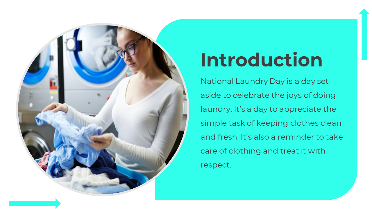 National Laundry Day is an annual celebration that honors the importance of clean clothes and the hard work that goes into keeping them that way. On this day, people take the time to appreciate the convenience of modern laundry machines and the many products available to keep their clothes clean and fresh. It's also a great time to donate gently used clothing to those in need. With the right tools and techniques, doing laundry can be a satisfying and rewarding chore. Celebrate National Laundry Day by learning some new laundry hacks or simply taking pride in your clean and fresh clothes. And don't forget to check out our National Laundry Day template for your presentation needs.