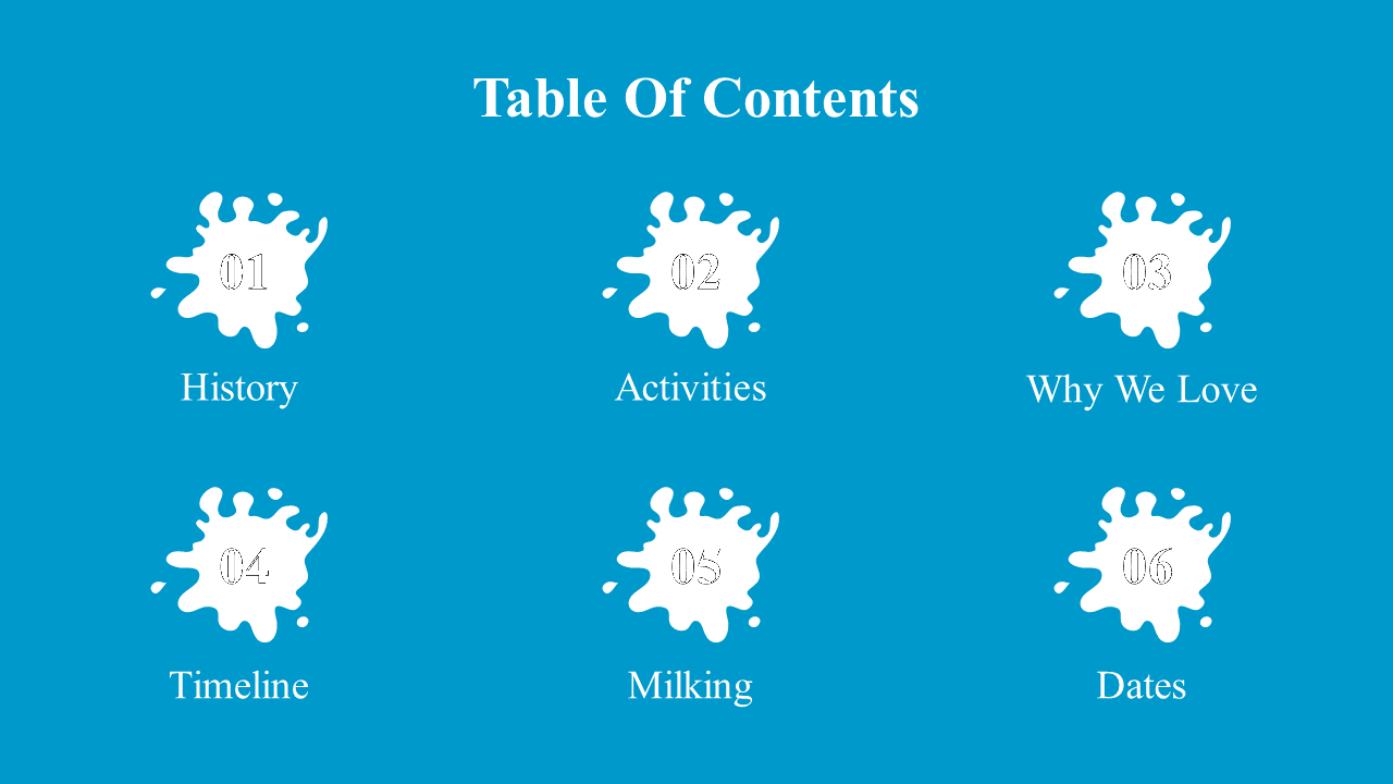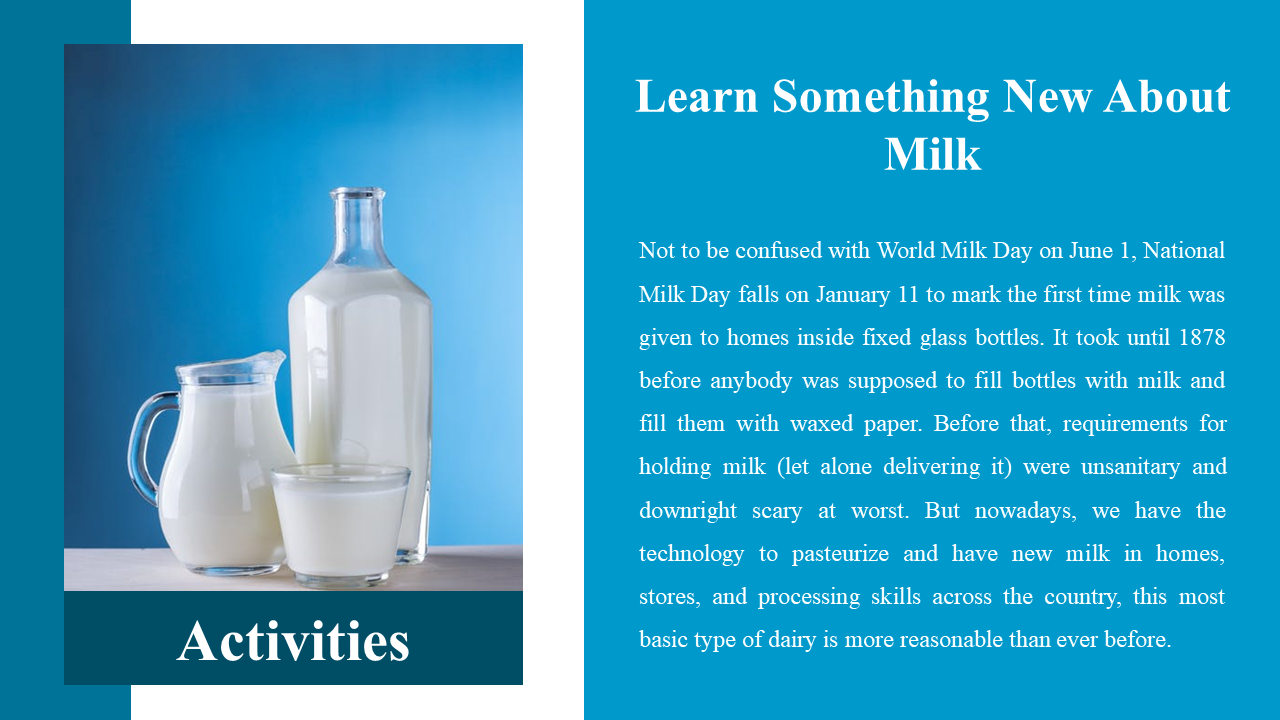It's time to drink some milk! Discover the benefits of this drink: good for your health, rich in nutrients and calcium, and a source of vitamins and minerals. How many times have you thought about this drink? Let's share it with all your friends and maybe get some to share as well. By presenting these slides on World Milk Day. We provide you with a bunch of icons that you can use throughout the presentation to bring attention to certain aspects of the topic. The World Milk Day Presentation Template is ideal for use in meetings and presentations, as it includes a large number of illustrations.