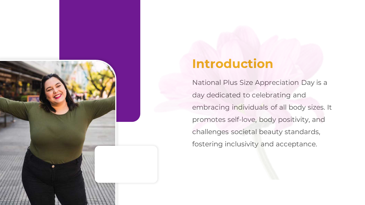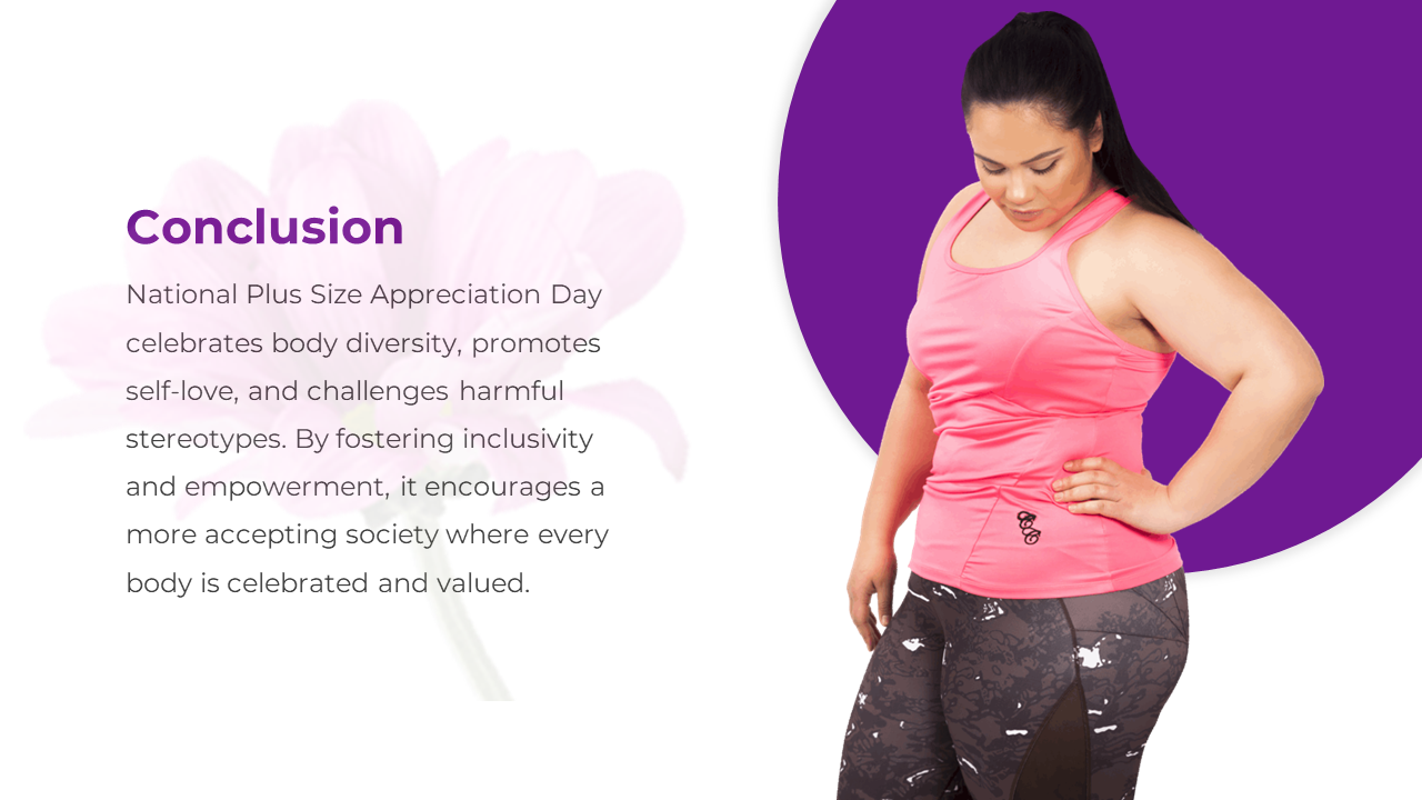 National Plus Size Appreciation Day is a day of celebration, empowerment, and self-love. Observed on October 6th in the United States, this day aims to break down societal beauty standards and promote body positivity. It's a day to recognize and appreciate people of all shapes and sizes, particularly those in the plus-size community. The concept revolves around fostering self-confidence, acceptance, and embracing one's body as it is. It's a reminder that beauty comes in various forms, and everyone deserves to feel comfortable and proud in their own skin. Whether you're plus-size or an ally, this day encourages you to challenge stereotypes, support body diversity, and celebrate the uniqueness of each individual. Our National Plus Size Appreciation Day templates is a powerful tool to amplify the message of self-love and body positivity. Designed for educators, activists, or anyone looking to create awareness about body acceptance, this template offers a range of customizable slides. Offers flexibility to tailor your content to various topics related to body positivity. With fully editable features, you have the flexibility to adapt the template to your unique style and content. Whether you're hosting workshops, giving talks, or organizing events, this template will enhance your efforts in promoting a more inclusive and self-affirming society.